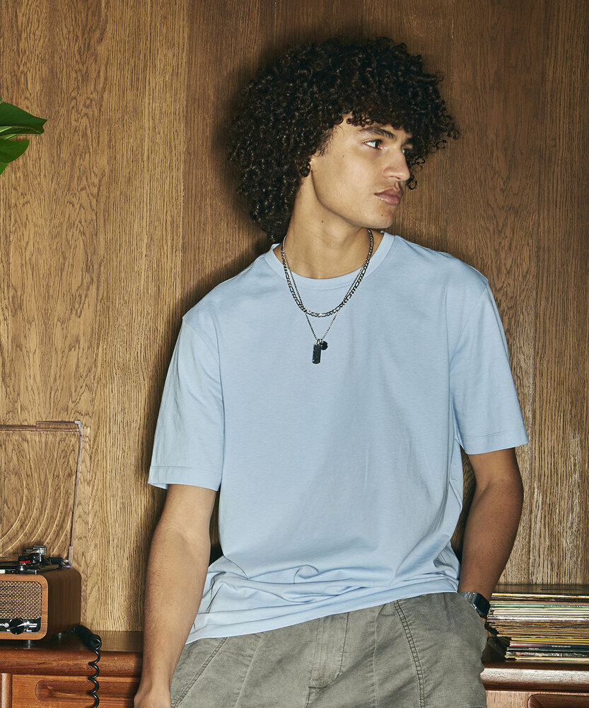 Relaxed fit T. Short sleeves. Side seams. PurePrint BC Cotton fabric. Taped back neck. Twin needle stitch details. Ribbed crew neck. Size label only for easy rebranding.