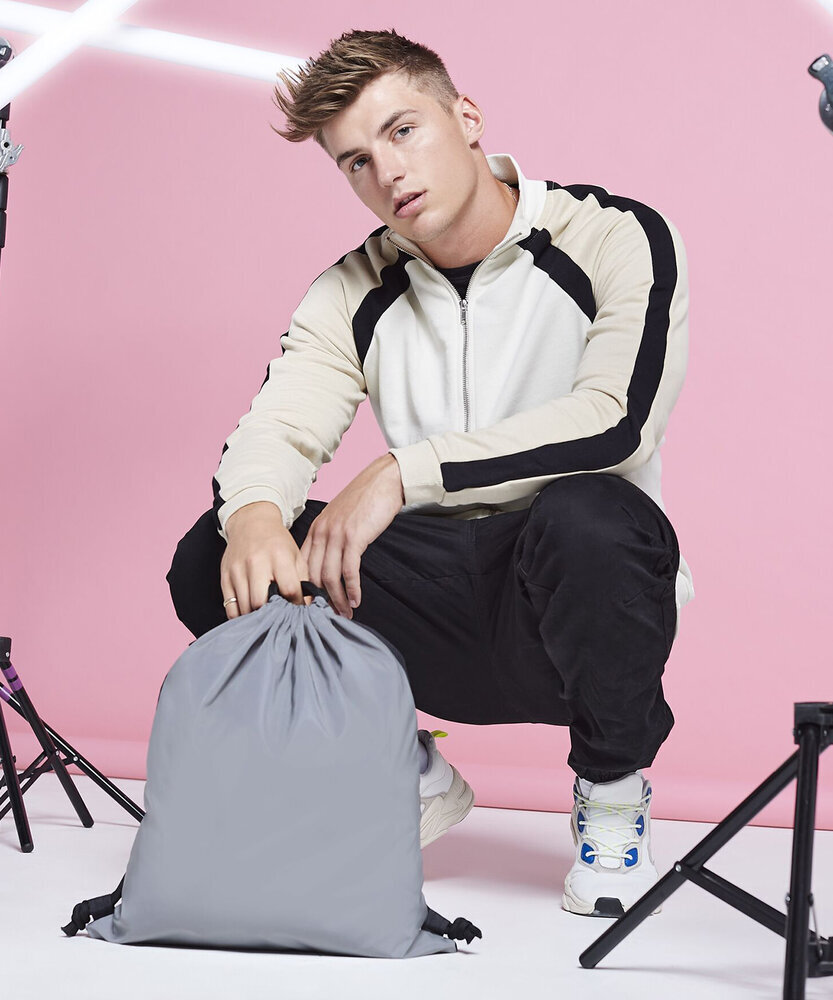TearAway label for ease of rebranding. Lightweight yet durable. Reflective powder coating for enhanced visibility. self-fabric cord loops for ease of decoration. Zippered external stash pocket. Chunky drawcord closure.