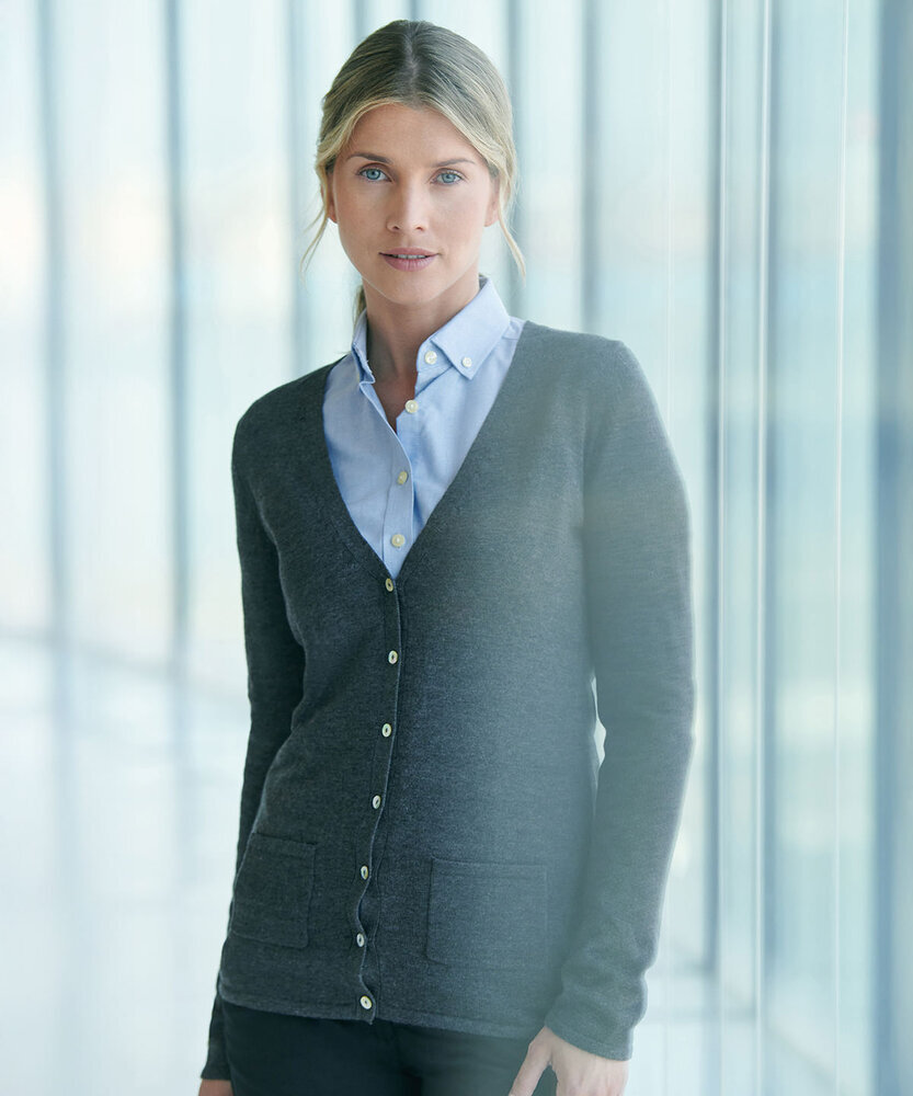Fine Knit 12 Gauge V Cardigan. Semi Fashioned sleeve and Neck detail. Shell effect buttons. Set in sleeves. 1x1 neck rib. Tube knit waist and cuff. Co-ordinates with Men’s HB720 and Women’s HB721