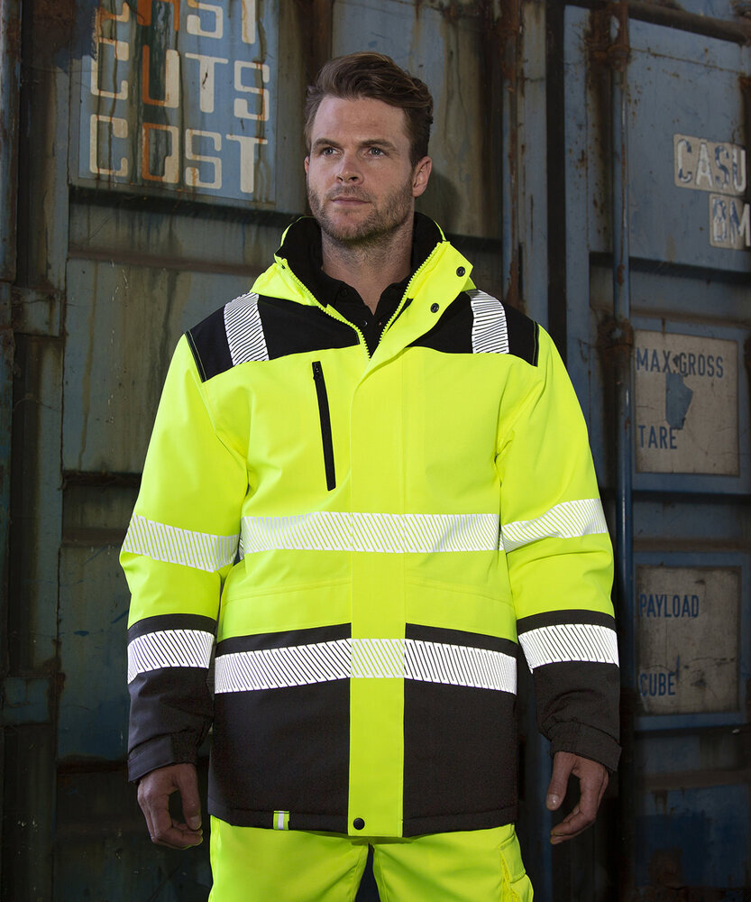 EN343 3:1 Waterproof 8000mm, Breathable 3000mvp, Windproof. Soft-feel printed safety body bands. Tear release and part elasticised cuff. Adjustable foldaway hood. Tear release front pocket and stormflap. Zip chest pockets. Black colour contrast. Quilted lining. Stand-up collar. Taped seams. Hangtag. Ready to brand - tag free. EN ISO 20471:2013+A1-2016 - Class 2. RIS-3279-TOM - Class 2 (Orange only).