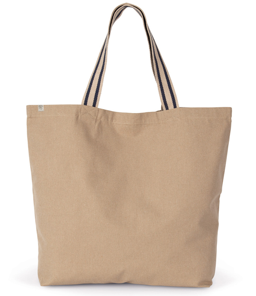 80% recycled cotton/20% recycled polyester. Contrast striped carry/shoulder straps (60cm long).Tag free.Capacity 48 litres.Recycled cotton is made from pre-consumer waste and recycled polyester made from post-consumer waste.Special Order items are non-stock Items ordered from the supplier. These items are non-returnable, and lead times may vary.