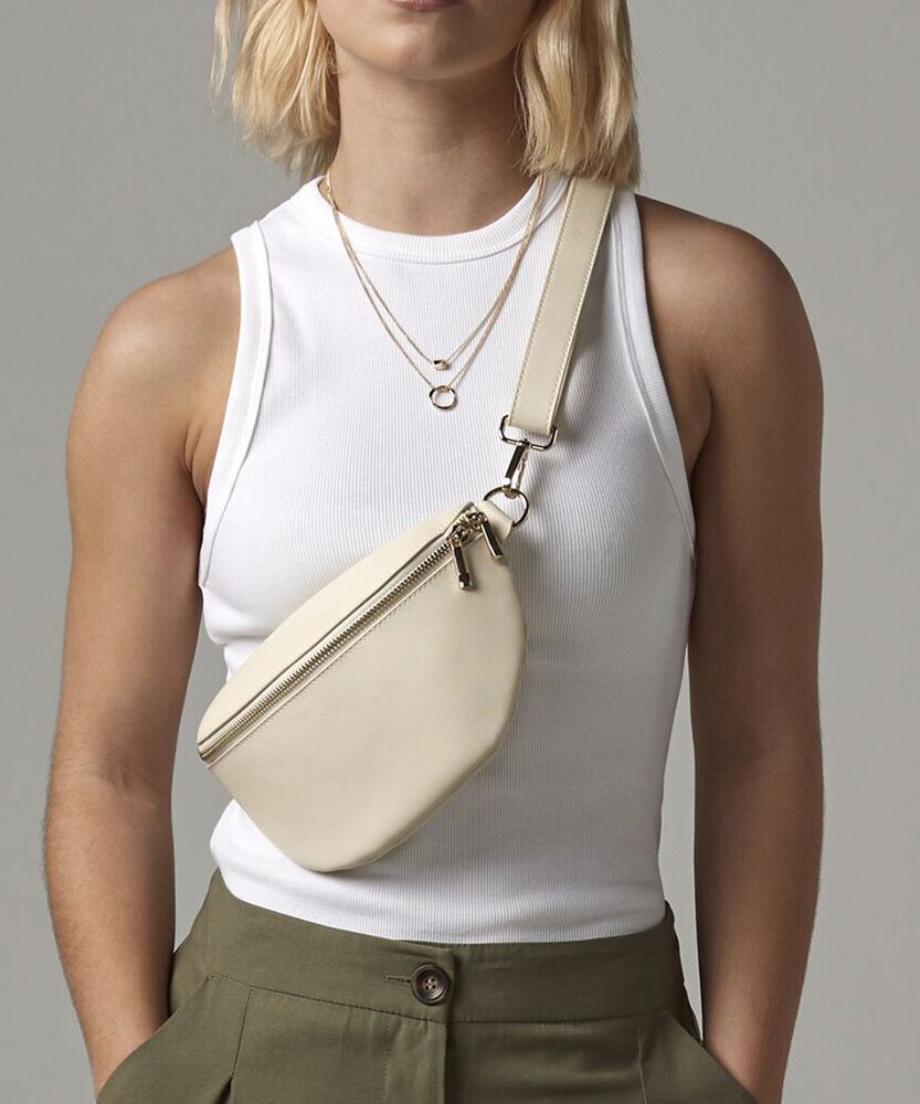PU backing and lining. Saffiano fine grain. Zipped main compartment. Internal slip pocket. Soft-touch lining. Detachable and adjustable cross-body strap. High-shine gold metal zip. Tear-away label for ease of rebranding.