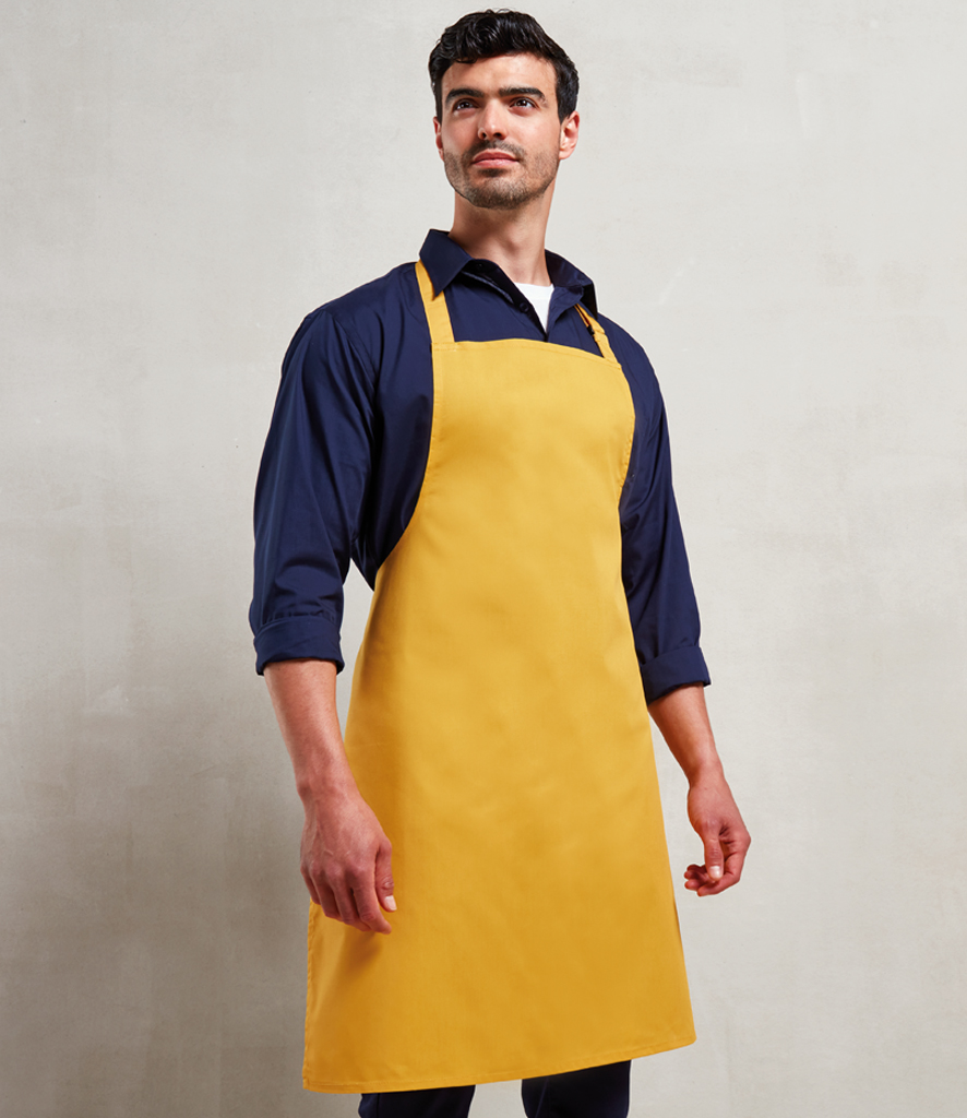 65% polyester/35% cotton.* Easy care fabric. Self fabric neckband with sliding, adjustable buckle. Self fabric 90cm ties. Industrial laundry 85°C. Domestic wash 60°C.