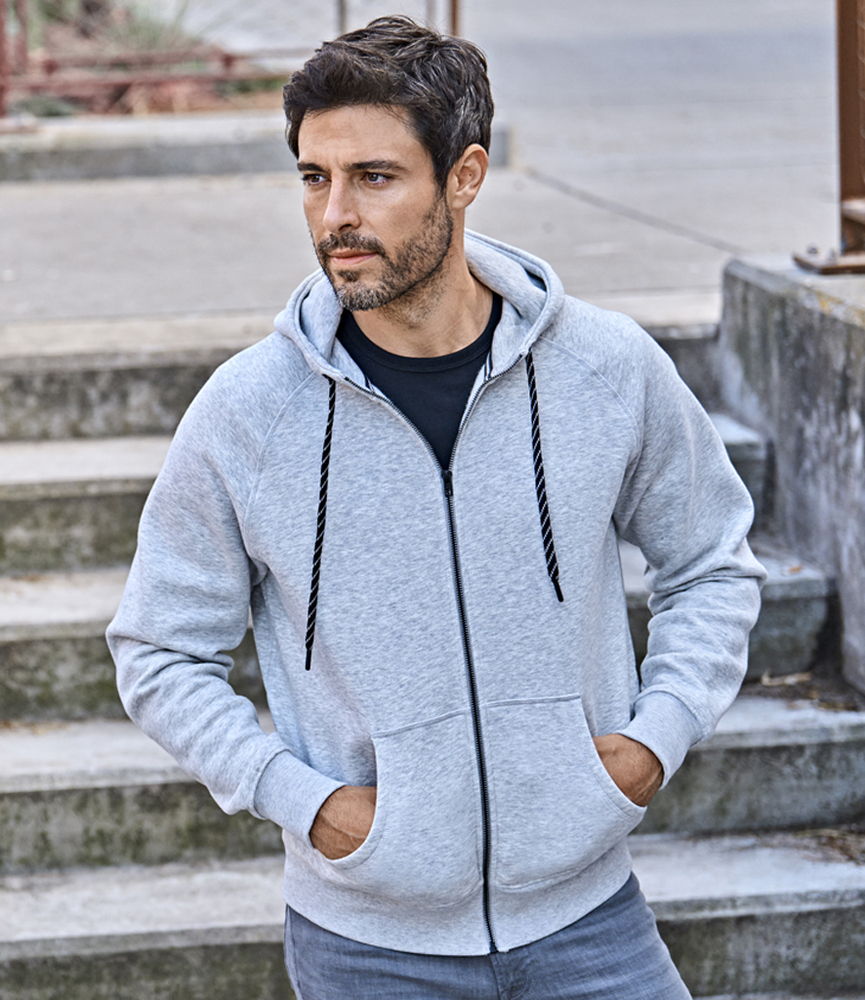 70% ringspun cotton/30% polyester. Brushed back fleece. Raglan sleeves. Fitted style. Two panel lined hood. Contrast striped drawcord with branded eyelets. Full length zip. Front pouch pockets. Ribbed cuffs and hem with elastane.