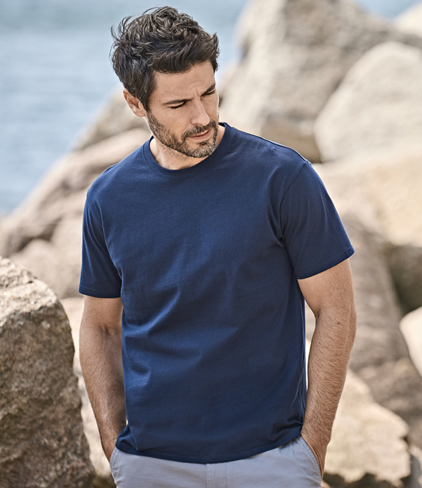 100% supercarded organic cotton. Narrow ribbed collar with elastane. Taped neck and shoulders. Tubular body. Twin needle stitching. Tag free.